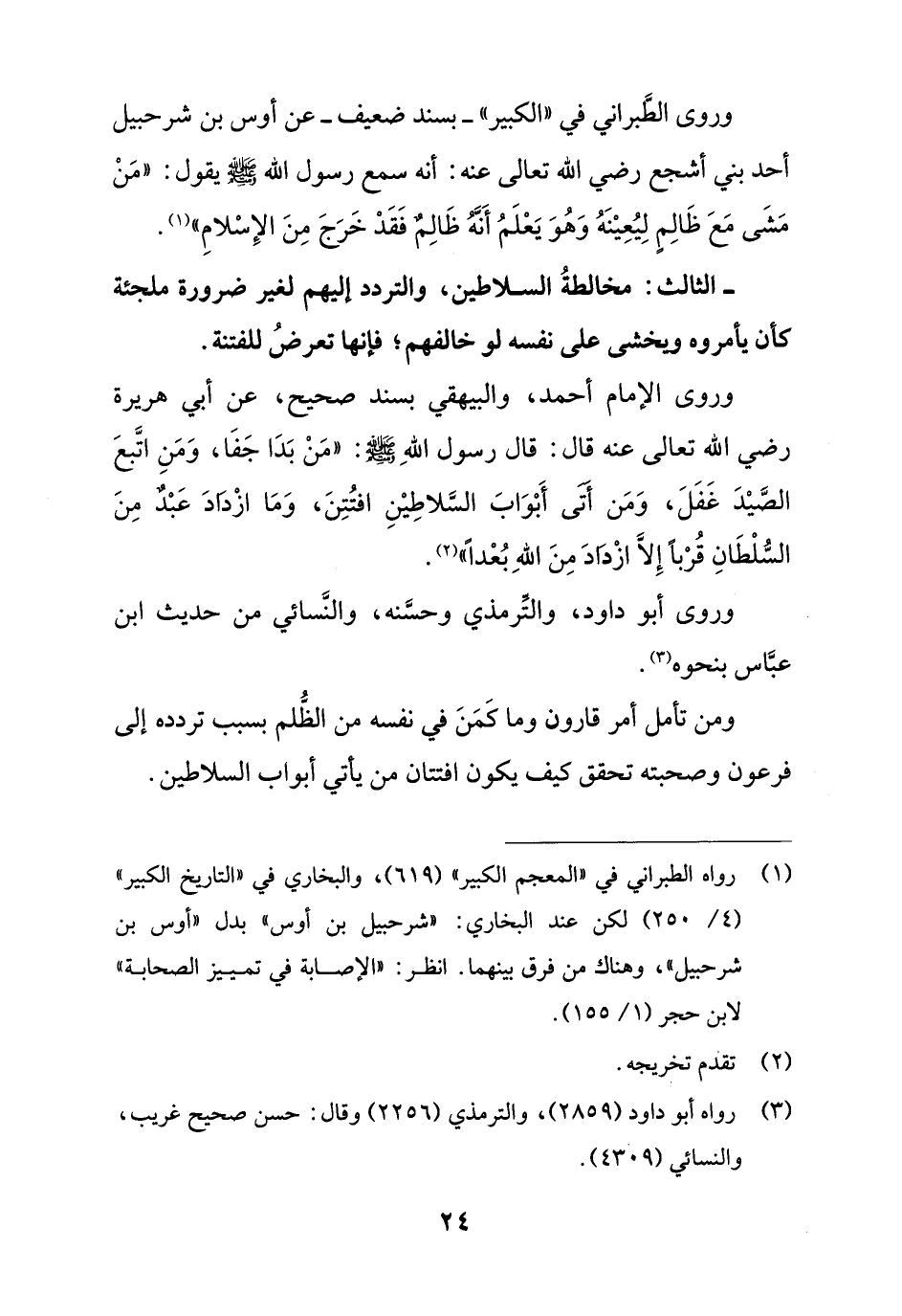 وروى الإمام أحمد، والبيهقي بسند صحيح، عن أبي هريرة رضي الله تعالى عنه قال: قال رسول الله - صلى الله عليه وسلم -: "مَنْ بَدا جَفَا، وَمَنِ اتَّبعَ الصَّيْدَ غَفَلَ، وَمَن أتى أَبْوابَ السَّلاطِيْنِ افتُتِنَ، وَمَا ازْدَادَ عَبْدٌ مِنَ السُّلْطانِ قُرْبًا إِلَّا ازْدادَ مِنَ اللهِ بُعْداً" (¬2).