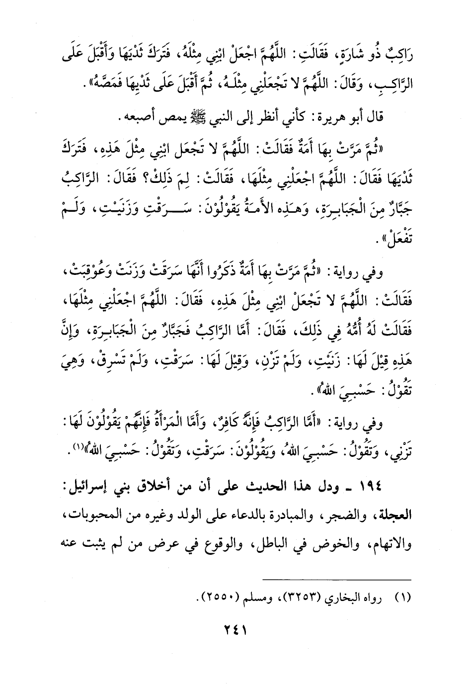 194 - ودل هذا الحديث على أن من أخلاق بني إسرائيل: العجلة، والضجر، والمبادرة بالدعاء على الولد وغيره من المحبوبات، والاتهام، والخوض في الباطل، والوقوع في عرض من لم يثبت عنه