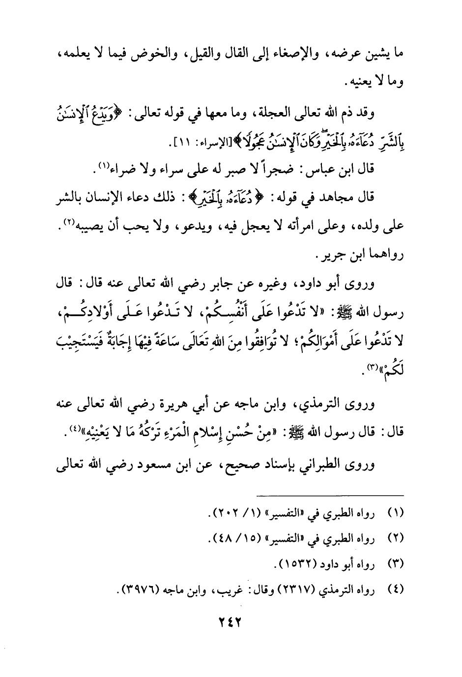 وروى أبو داود، وغيره عن جابر رضي الله تعالى عنه قال: قال رسول الله - صلى الله عليه وسلم -: "لا تَدْعُوا عَلَى أَنْفُسِكُمْ، لا تَدْعُوا عَلَى أَوْلادِكُمْ، لا تَدْعُوا عَلَى أَمْوَالِكُمْ؛ لا تُوَافِقُوا مِنَ اللهِ تَعَالَى سَاعَة فِيْهَا إِجَابَة فَيَسْتَجِيْبَ لَكُمْ" (¬3).