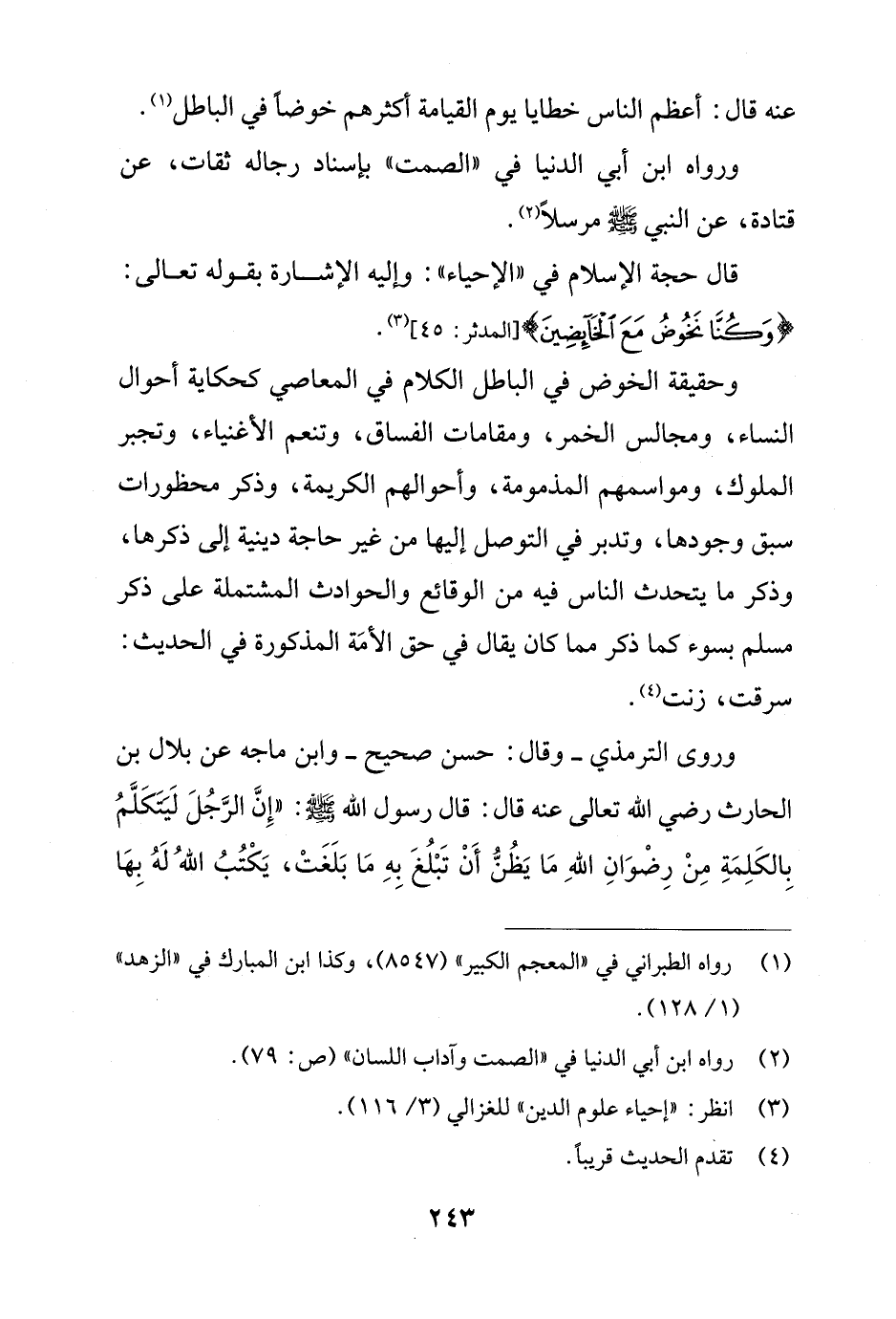 قال حجة الإِسلام في "الإحياء": وإليه الإشارة بقوله تعالى: {وَكُنَّا نَخُوضُ مَعَ الْخَائِضِينَ} [المدثر: 45] (¬3).