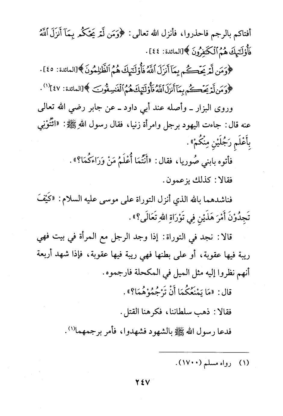 وروى البزار - وأصله عند أبي داود - عن جابر رضي الله تعالى عنه قال: جاءت اليهود برجل وامرأة زنيا، فقال رسول الله - صلى الله عليه وسلم -: "ائتوْني بِأَعْلَمِ رَجُلَيْنِ مِنْكُمْ".