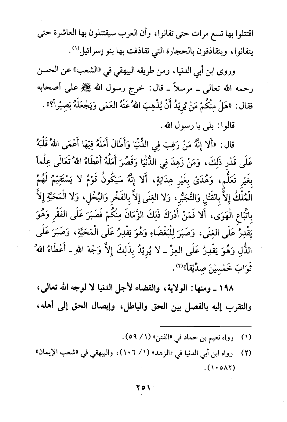 198 - ومنها: الولاية، والقضاء لأجل الدنيا لا لوجه الله تعالى، والتقرب إليه بالفصل بين الحق والباطل، وإيصال الحق إلى أهله،