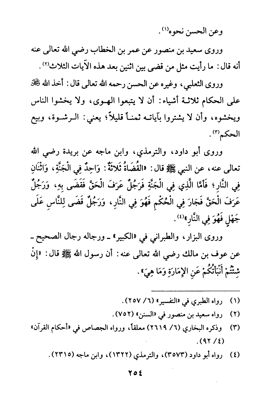 وروى أبو داود، والترمذي، وابن ماجه عن بريدة رضي الله تعالى عنه، عن النبي -صلى الله عليه وسلم- قال: "القُضاةُ ثَلاثةٌ: واحِدٌ في الْجَنَّةِ، واثْنانِ في النَّارِ؛ فَأمَّا الّذِي في الْجَنّةِ فَرَجُلٌ عَرَفَ الْحَقَّ فَقَضَى بِهِ، وَرَجُلٌ عَرَفَ الْحَقَّ فَجارَ في الْحُكْمِ فَهُوَ في النَّارِ، وَرَجُل قَضَى لِلنَّاسِ عَلَى جَهْلِ فَهُوَ في النَّارِ" (¬4).
