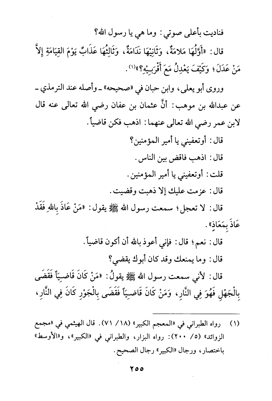 وروى أبو يعلى، وابن حبَّان في "صحيحه" -وأصله عند الترمذي- عن عبد الله بن موهب: أنَّ عثمان بن عفان رضي الله تعالى عنه قال لابن عمر رضي الله تعالى عنهما: اذهب فكن قاضياً.