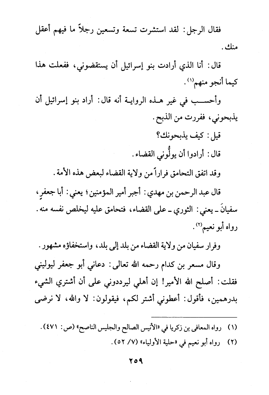 قال عبد الرحمن بن مهدي: أجبر أمير المؤمنين؟ يعني: أبا جعفرٍ، سفيانَ -يعني: الثوري- على القضاء، فتحامق عليه ليخلص نفسه منه. رواه أبو نعيم (¬2).