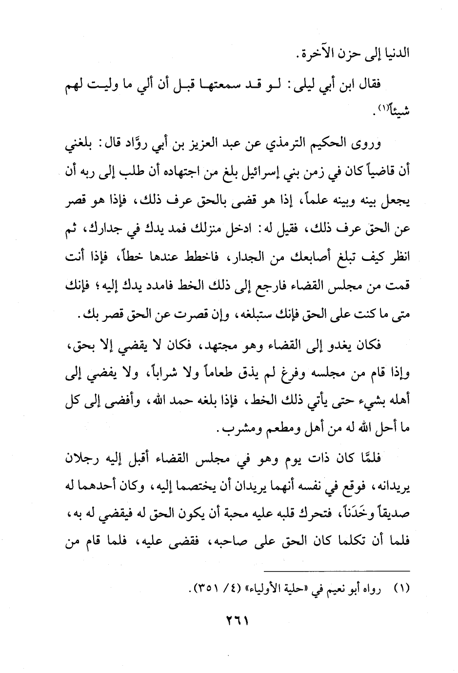 وروى الحكيم الترمذي عن عبد العزيز بن أبي روَّاد قال: بلغني أن قاضيًا كان في زمن بني إسرائيل بلغ من اجتهاده أن طلب إلى ربه أن يجعل بينه وبينه علمًا، إذا هو قضى بالحق عرف ذلك، فإذا هو قصر عن الحق عرف ذلك، فقيل له: ادخل منزلك فمد يدك في جدارك، ثمَّ انظر كيف تبلغ أصابعك من الجدار، فاخطط عندها خطًّا، فإذا أنت قمت من مجلس القضاء فارجع إلى ذلك الخط فامدد يدك إليه؛ فإنك متى ما كنت على الحق فإنك ستبلغه، وإن قصرت عن الحق قصر بك.