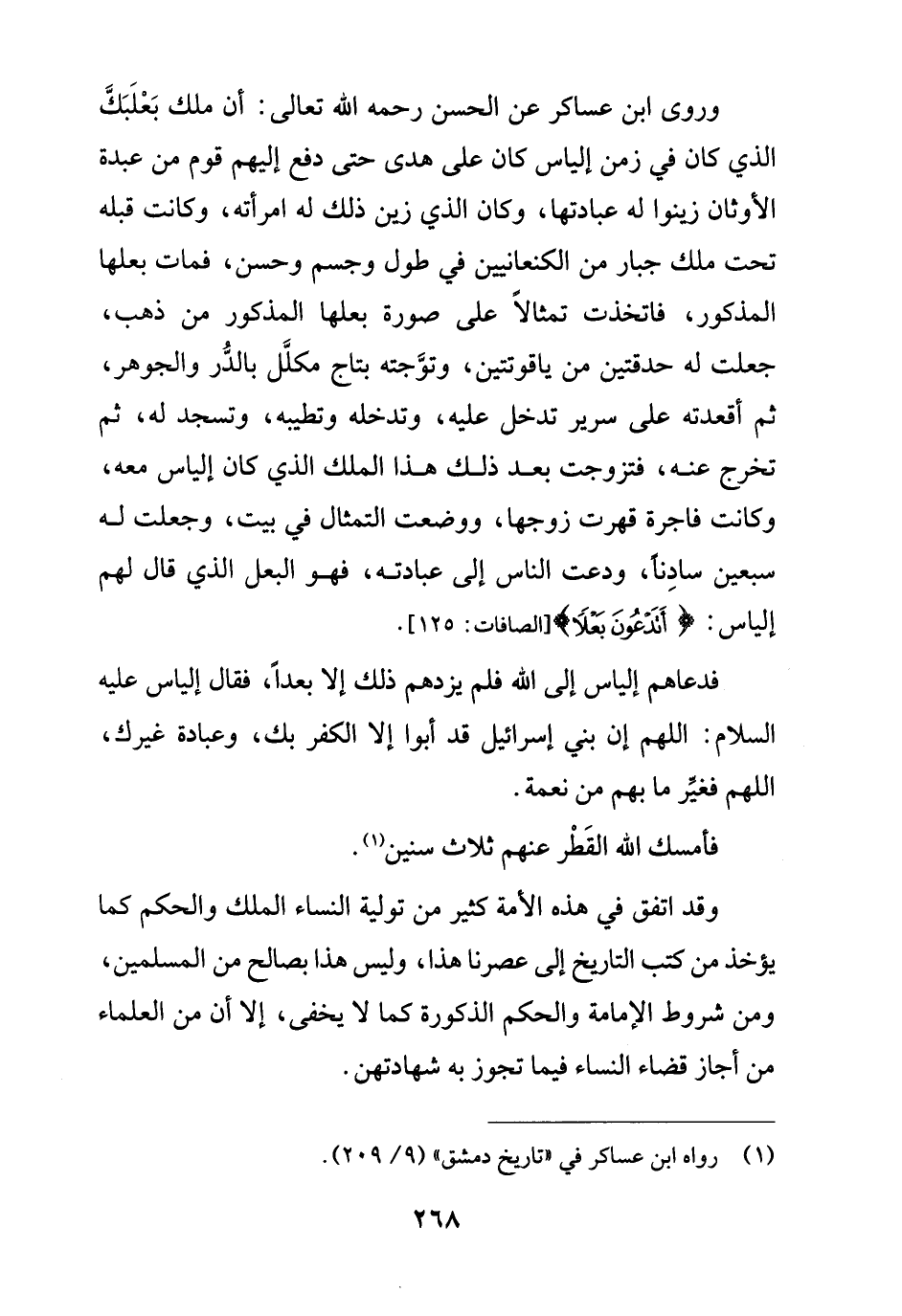 وروى ابن عساكر عن الحسن رحمه الله تعالى: أن ملك بَعْلَبَكَّ الذي كان في زمن إلياس كان على هدى حتى دفع إليهم قوم من عبدة الأوثان زينوا له عبادتها، وكان الذي زين ذلك له امرأته، وكانت قبله تحت ملك جبار من الكنعانيين في طول وجسم وحسن، فمات بعلها المذكور، فاتخذت تمثالًا على صورة بعلها المذكور من ذهب، جعلت له حدقتين من ياقوتتين، وتوَّجته بتاج مكلَّل بالحُّر والجوهر، ثمَّ أقعدته على سرير تدخل عليه، وتدخله وتطيبه، وتسجد له، ثمَّ تخرج عنه، فتزوجت بعد ذلك هذا الملك الذي كان إلياس معه، وكانت فاجرة قهرت زوجها، ووضعت التمثال في بيت، وجعلت له سبعين سادِناً، ودعت الناس إلى عبادته، فهو البعل الذي قال لهم إلياس: {أَتَدْعُونَ بَعْلًا} [الصافات: 125].