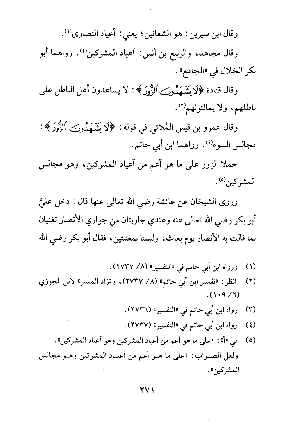 وقال قتادة {لَا يَشْهَدُونَ الزُّورَ}: لا يساعدون أهل الباطل على باطلهم، ولا يمالئونهم (¬3).