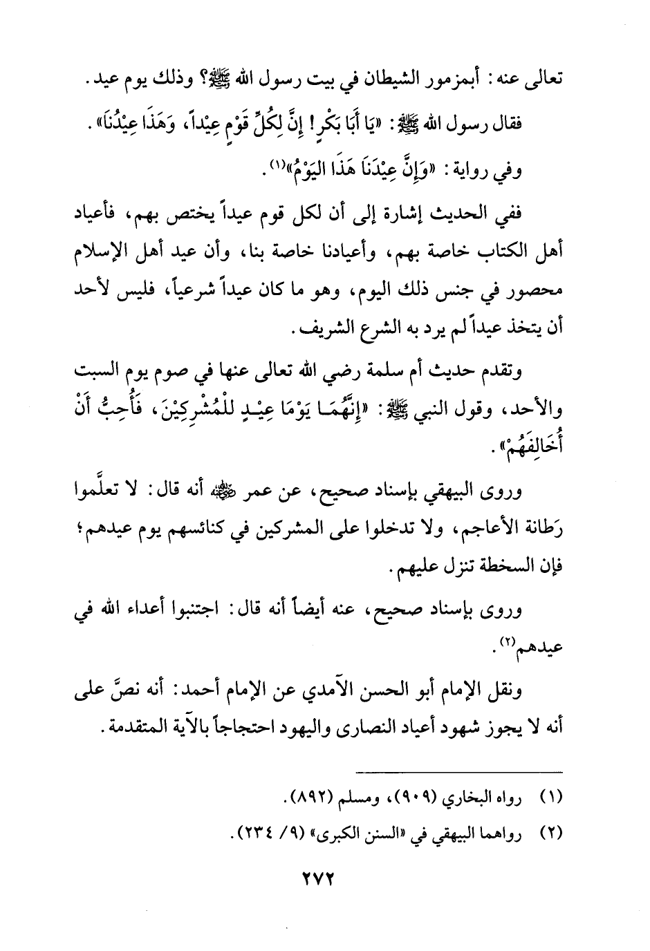 ففي الحديث إشارة إلى أن لكل قوم عيدًا يختص بهم، فأعياد أهل الكتاب خاصة بهم، وأعيادنا خاصة بنا، وأن عيد أهل الإِسلام محصور في جنس ذلك اليوم، وهو ما كان عيدًا شرعيًا، فليس لأحد أن يتخذ عيدًا لم يرد به الشرع الشريف.