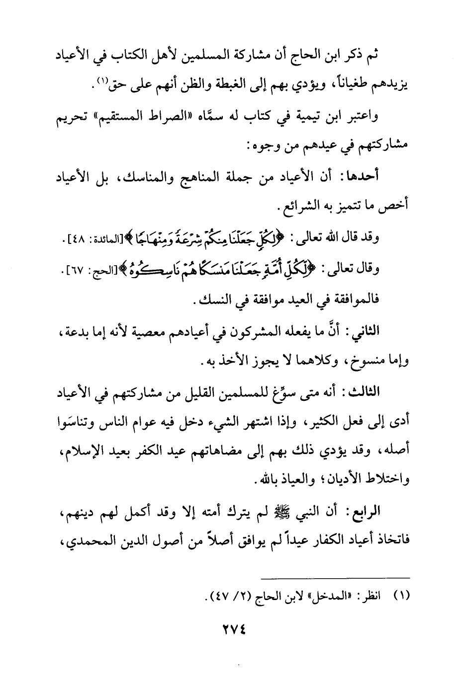 واعتبر ابن تيمية في كتاب له سمَّاه "الصراط المستقيم" تحريم مشاركتهم في عيدهم من وجوه: