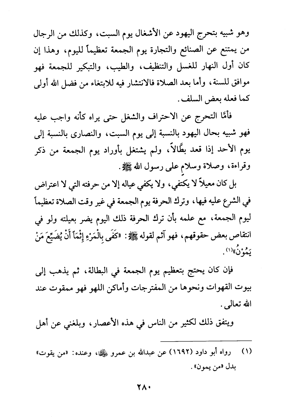 فأمَّا التحرج عن الاحتراف والشغل حتى يراه كأنه واجب عليه فهو شبيه بحال اليهود بالنسبة إلى يوم السبت، والنصارى بالنسبة إلى يوم الأحد إذا قعد بطّالًا، ولم يشتغل بأوراد يوم الجمعة من ذكر وقراءة، وصلاة وسلامٍ على رسول الله - صلى الله عليه وسلم -.