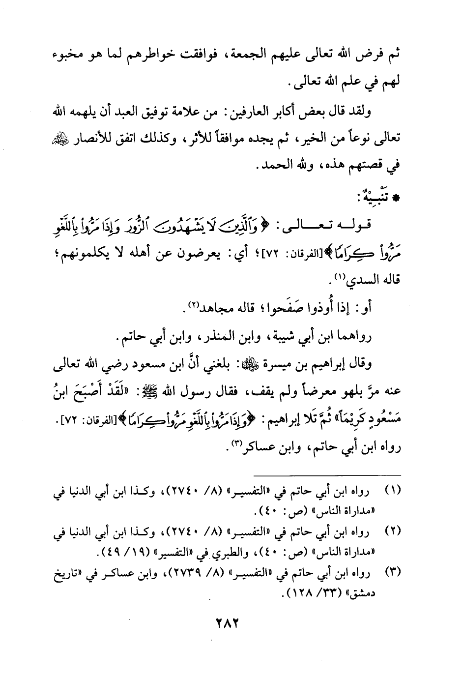 وقال إبراهيم بن ميسرة - رضي الله عنهما -: بلغني أنَّ ابن مسعود رضي الله تعالى عنه مرَّ بلهو معرضاً ولم يقف، فقال رسول الله -صلى الله عليه وسلم-: "لَقَدْ أصْبَحَ ابنُ مَسْعُودٍ كَرِيْماً" ثُمَّ تَلا إبراهيم: {وَإِذَا مَرُّوا بِاللَّغْوِ مَرُّوا كِرَامًا} [الفرقان: 72].