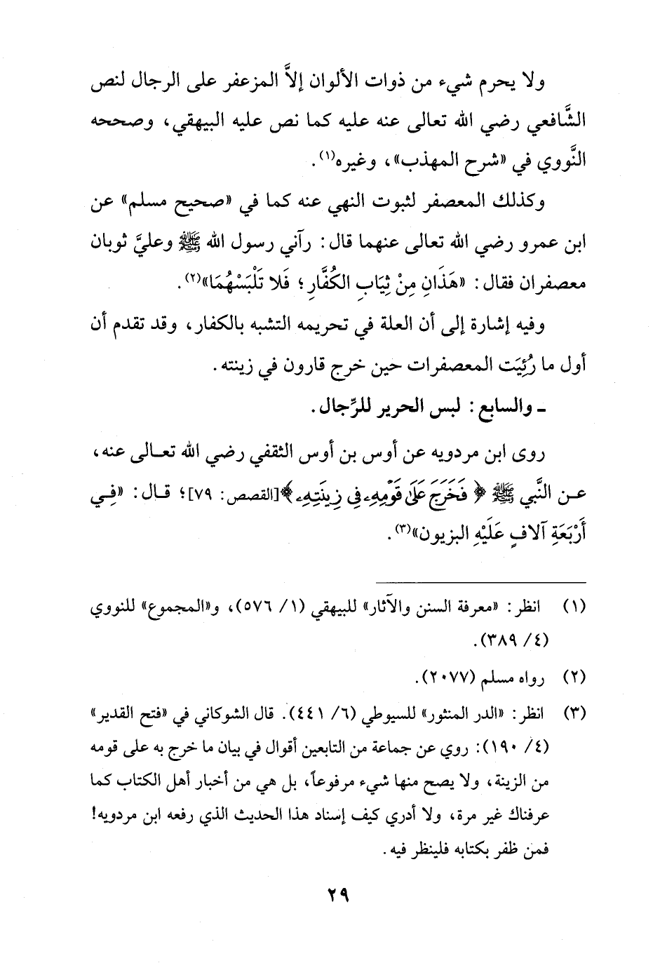 وكذلك المعصفر لثبوت النهي عنه كما في "صحيح مسلم" عن ابن عمرو رضي الله تعالى عنهما قال: رآني رسول الله -صلى الله عليه وسلم- وعليَّ ثوبان معصفران فقال: "هَذانِ مِنْ ثِيابِ الكُفَّارِ؛ فَلا تَلْبَسْهُمَا" (¬2).