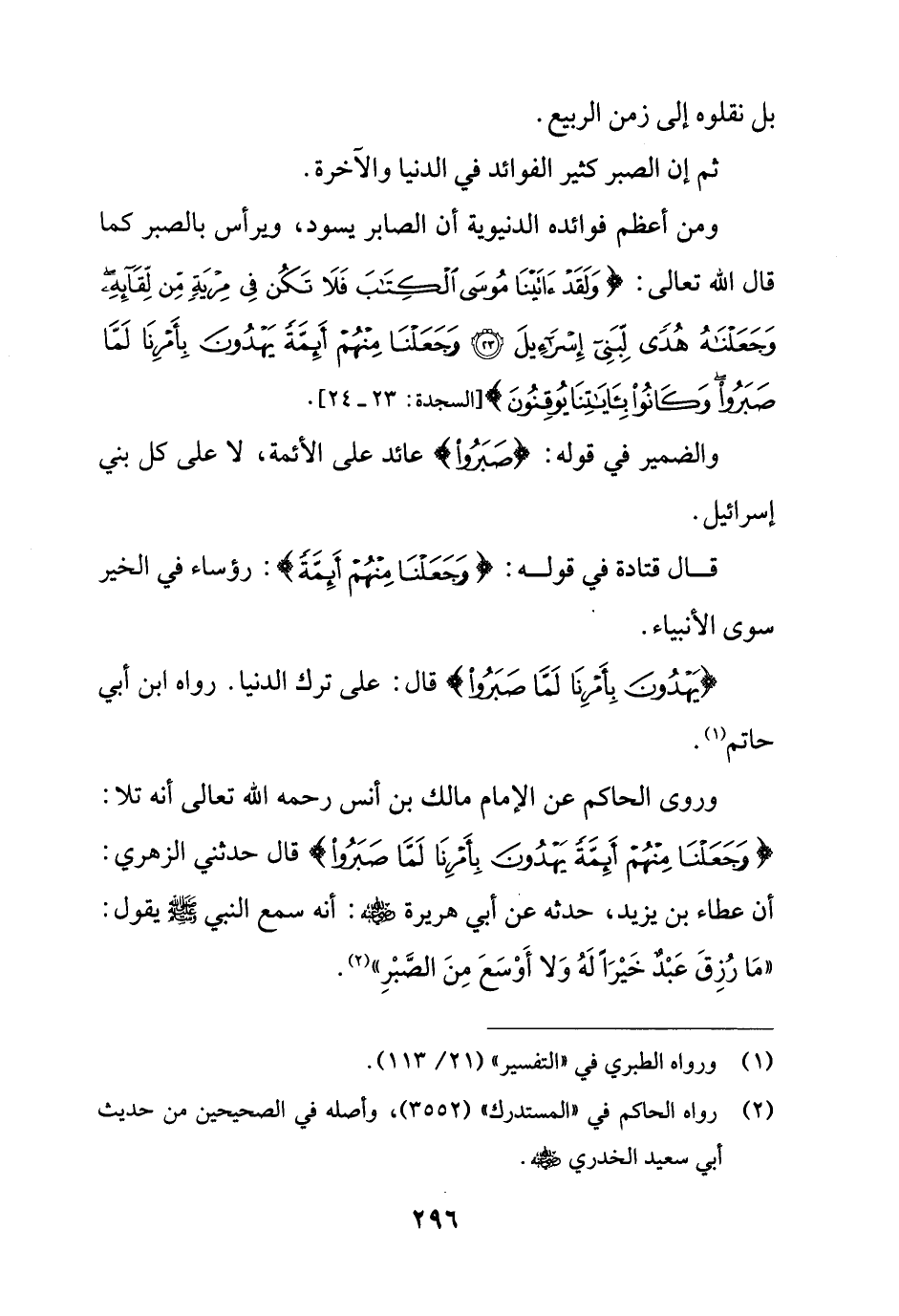 وروى الحاكم عن الإمام مالك بن أنس رحمه الله تعالى أنه تلا: {وَجَعَلْنَا مِنْهُمْ أَئِمَّةً يَهْدُونَ بِأَمْرِنَا لَمَّا صَبَرُوا} قال حدثني الزهري: أن عطاء بن يزيد، حدثه عن أبي هريرة - رضي الله عنه -: أنه سمع النبي -صلى الله عليه وسلم- يقول: "ما رُزِقَ عَبْدٌ خَيْرًا لَهُ وَلَا أَوْسَعَ مِنَ الصَّبْرِ" (¬2).