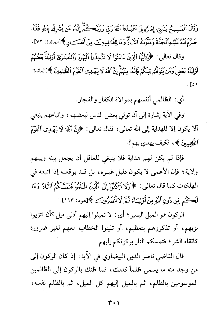 قال القاضي ناصر الدين البيضاوي في الآية: إذا كان الركون إلى من وجد منه ما يسمى ظلمًا كذلك، فما ظنك بالركون إلى الظالمين الموسومين بالظلم، ثم بالميل إليهم كل الميل، ثم بالظلم نفسه،