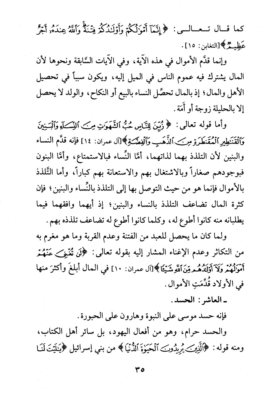 وإنما قدَّم الأموال في هذه الآية، وفي الآيات السَّابقة ونحوها لأن المال يشترك فيه عموم الناس في الميل إليه، ويكون سبباً في تحصيل الأهل والمال؛ إذ بالمال تحصِّل النساء بالبيع أو النكاح، والولد لا يحصل إلا بالحليلة زوجة أو أَمَة.