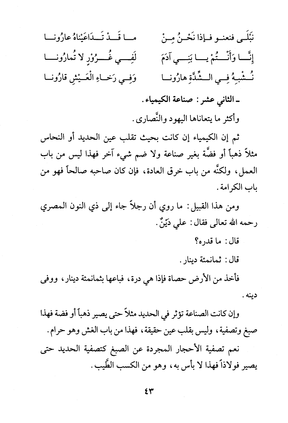 ثمَّ إن الكيمياء إن كانت بحيث تقلب عين الحديد أو النحاس مثلًا ذهبا أو فضَّة بغير صناعة ولا ضم شيء آخر فهذا ليس من باب العمل، ولكنَّه من باب خرق العادة، فإن كان صاحبه صالحًا فهو من باب الكرامة.