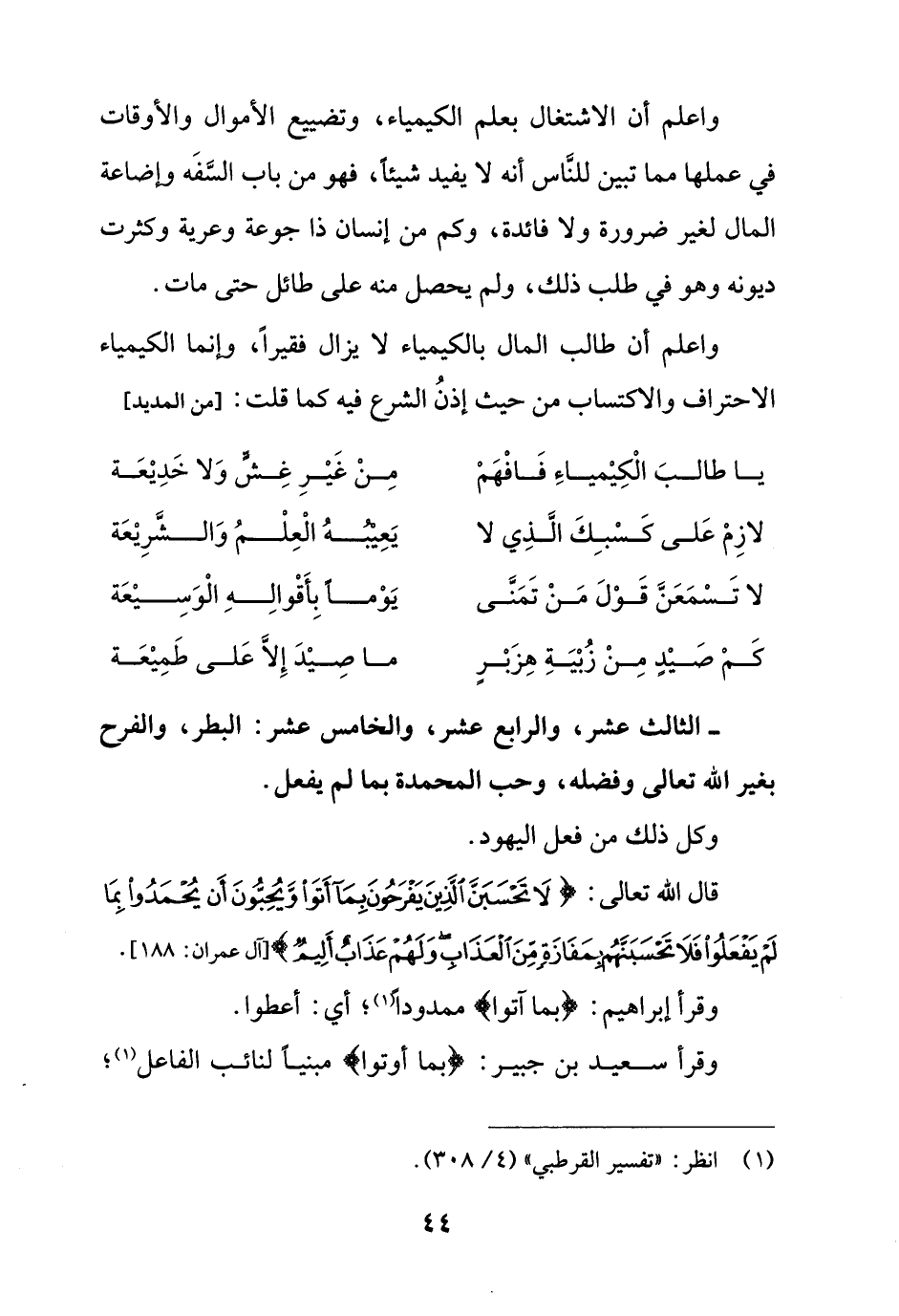 واعلم أن الاشتغال بعلم الكيمياء، وتضييع الأموال والأوقات في عملها مما تبيّن للنّاس أنه لا يفيد شيئًا، فهو من باب السَّفَه وإضاعة المال لغير ضرورة ولا فائدة، وكم من إنسان ذا جوعة وعرية وكثرت ديونه وهو في طلب ذلك، ولم يحصل منه على طائل حتى مات.