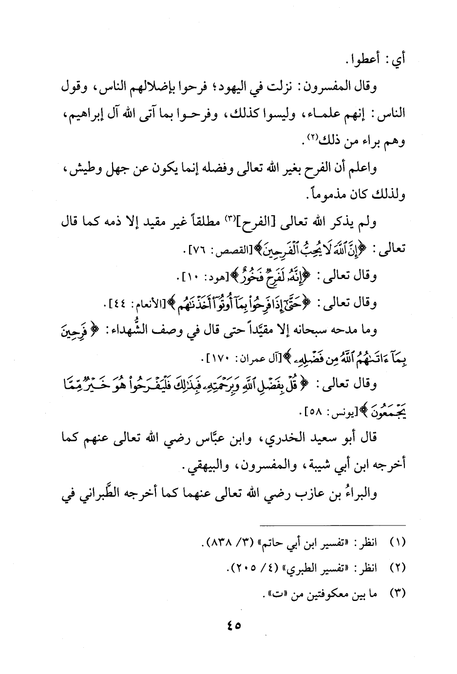 وما مدحه سبحانه إلا مقيدًا حتى قال في وصف الشُّهداء: {فَرِحِينَ بِمَا آتَاهُمُ اللَّهُ مِنْ فَضْلِهِ} [آل عمران: 170].