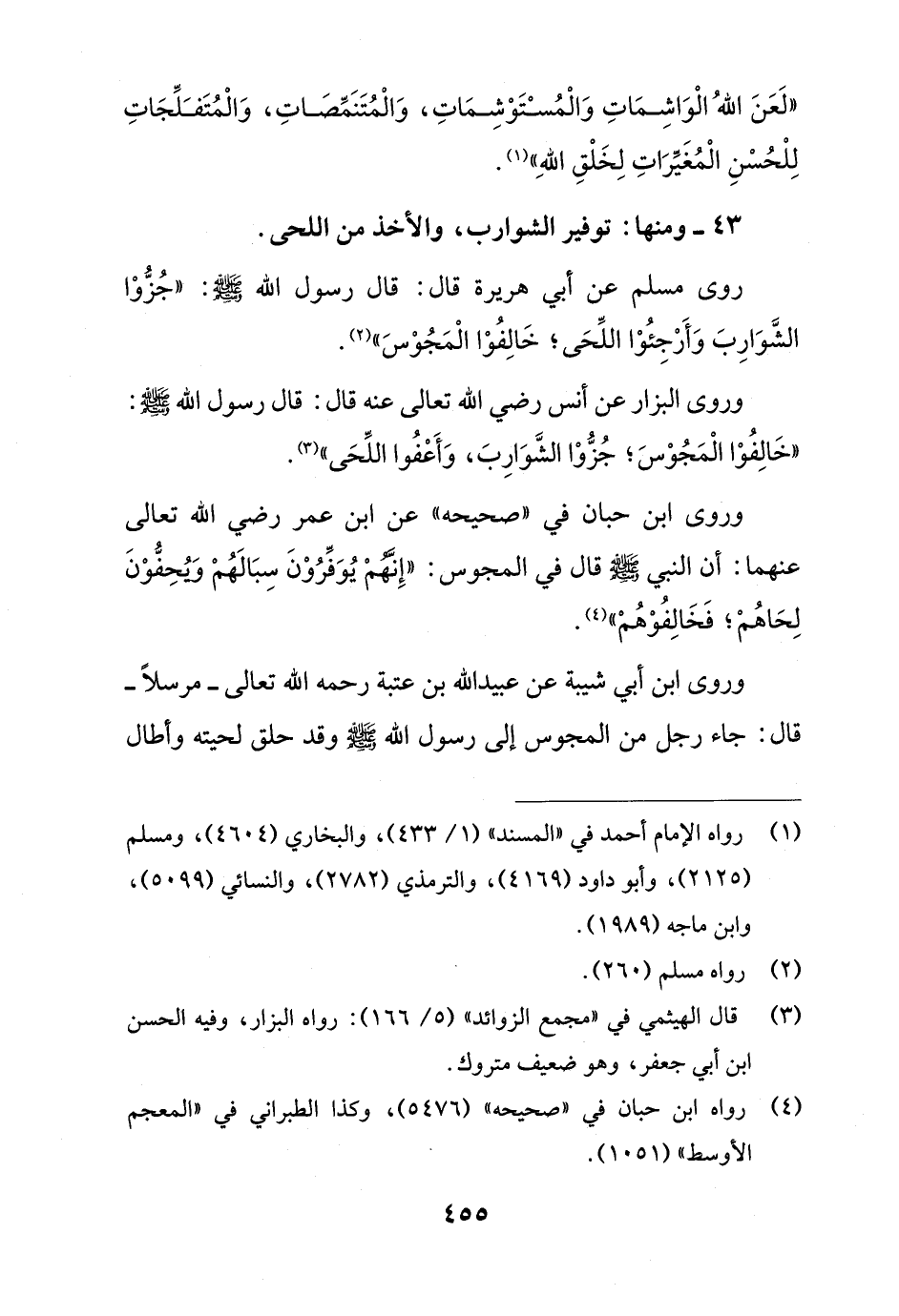 روى مسلم عن أبي هريرة قال: قال رسول الله - صلى الله عليه وسلم -: "جُزُّوْا الشَّوَارِبَ وَأَرْجِئُوْا اللِّحَى؛ خَالِفُوْا الْمَجُوْسَ" (¬2).