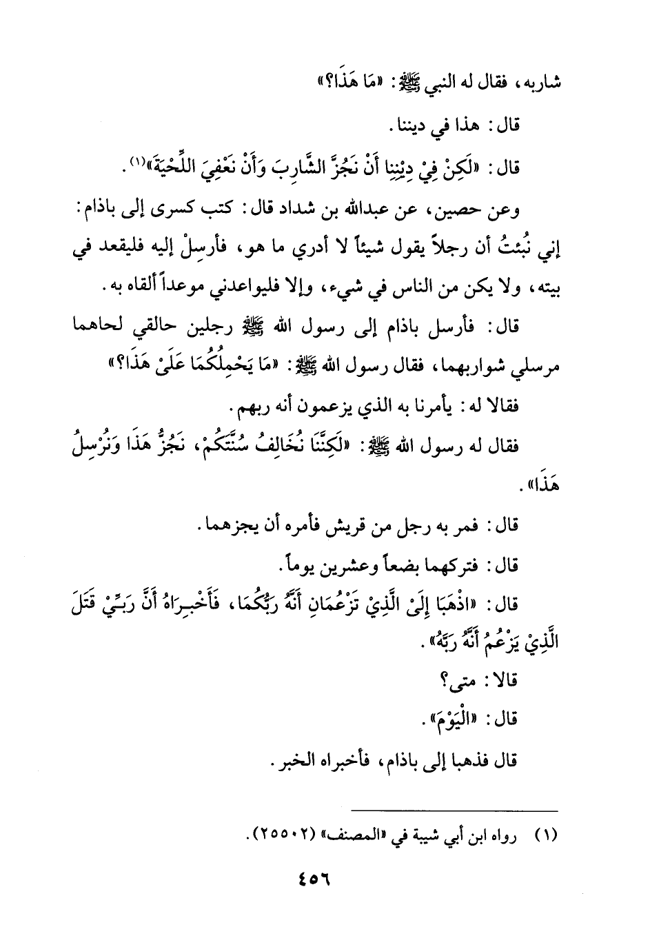 قال: فأرسل باذام إلى رسول الله - صلى الله عليه وسلم - رجلين حالقي لحاهما مرسلي شواربهما، فقال رسول الله - صلى الله عليه وسلم -: "مَا يَحْمِلُكُمَا عَلَىْ هَذَا؟ "