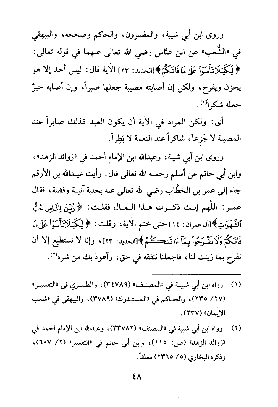 وروى ابن أبي شيبة، والمفسرون، والحاكم وصححه، والبيهقيّ في "الشُّعب" عن ابن عبَّاس رضي الله تعالى عنهما في قوله تعالى: {لِكَيْلَا تَأْسَوْا عَلَى مَا فَاتَكُمْ} [الحديد: 23]، الآية قال: ليس أحد إلا هو يحزن ويفرح، ولكن إن أصابته مصيبة جعلها صبرًا، وإن أصابه خيرٌ جعله شكرًا (¬1).