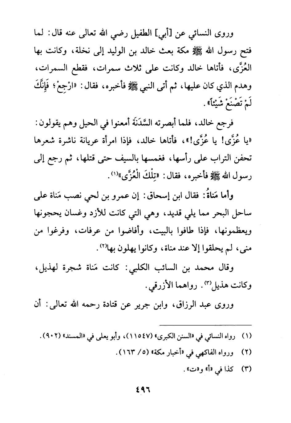 وروى النسائي عن [أبي] الطفيل رضي الله تعالى عنه قال: لما فتح رسول الله - صلى الله عليه وسلم - مكة بعث خالد بن الوليد إلى نخلة، وكانت بها العُزَّى، فأتاها خالد وكانت على ثلاث سمرات، فقطع السمرات، وهدم الذي كان عليها، ثم أتى النبي - صلى الله عليه وسلم - فأخبره، فقال: "ارْجِعْ؛ فَإِنَّكَ لَمْ تَصْنع شَيْئًا".