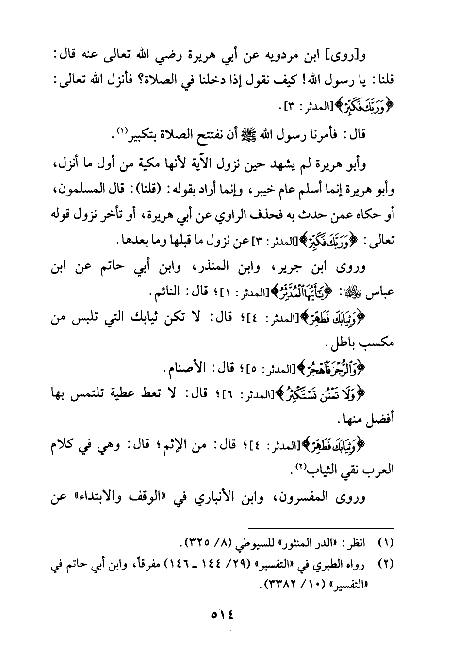وأبو هريرة لم يشهد حين نزول الآية لأنها مكية من أول ما أنزل، وأبو هريرة إنما أسلم عام خيبر، وإنما أراد بقوله: (قلنا): قال المسلمون، أو حكاه عمن حدث به فحذف الراوي عن أبي هريرة، أو تأخر نزول قوله تعالى: {وَرَبَّكَ فَكَبِّرْ} [المدثر: 3] عن نزول ما قبلها وما بعدها.