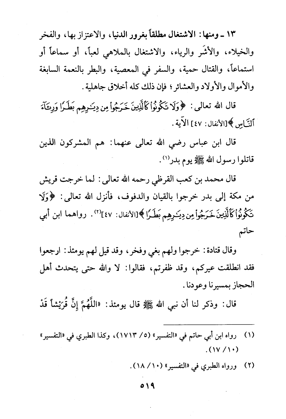 قال الله تعالى: {وَلَا تَكُونُوا كَالَّذِينَ خَرَجُوا مِنْ دِيَارِهِمْ بَطَرًا وَرِئَاءَ النَّاسِ} [الأنفال: 47] الآية.
