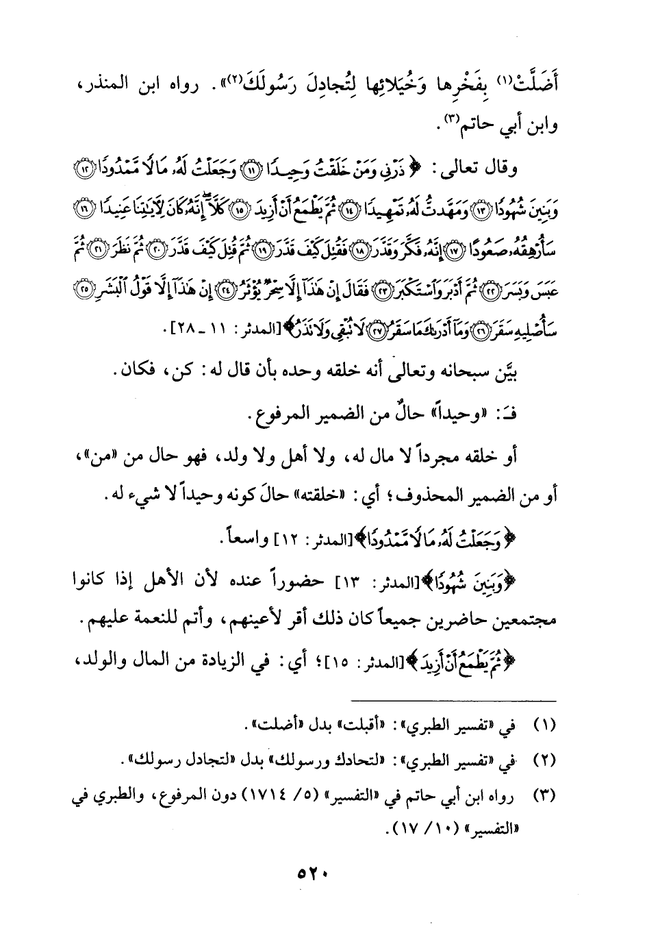 وقال تعالى: {ذَرْنِي وَمَنْ خَلَقْتُ وَحِيدًا (11) وَجَعَلْتُ لَهُ مَالًا مَمْدُودًا (12) وَبَنِينَ شُهُودًا (13) وَمَهَّدْتُ لَهُ تَمْهِيدًا (14) ثُمَّ يَطْمَعُ أَنْ أَزِيدَ (15) كَلَّا إِنَّهُ كَانَ لِآيَاتِنَا عَنِيدًا (16) سَأُرْهِقُهُ صَعُودًا (17) إِنَّهُ فَكَّرَ وَقَدَّرَ (18) فَقُتِلَ كَيْفَ قَدَّرَ (19) ثُمَّ قُتِلَ كَيْفَ قَدَّرَ (20) ثُمَّ نَظَرَ (21) ثُمَّ عَبَسَ وَبَسَرَ (22) ثُمَّ أَدْبَرَ وَاسْتَكْبَرَ (23) فَقَالَ إِنْ هَذَا إِلَّا سِحْرٌ يُؤْثَرُ (24) إِنْ هَذَا إِلَّا قَوْلُ الْبَشَرِ (25) سَأُصْلِيهِ سَقَرَ (26) وَمَا أَدْرَاكَ مَا سَقَرُ (27) لَا تُبْقِي وَلَا تَذَرُ} [المدثر: 11 - 28].