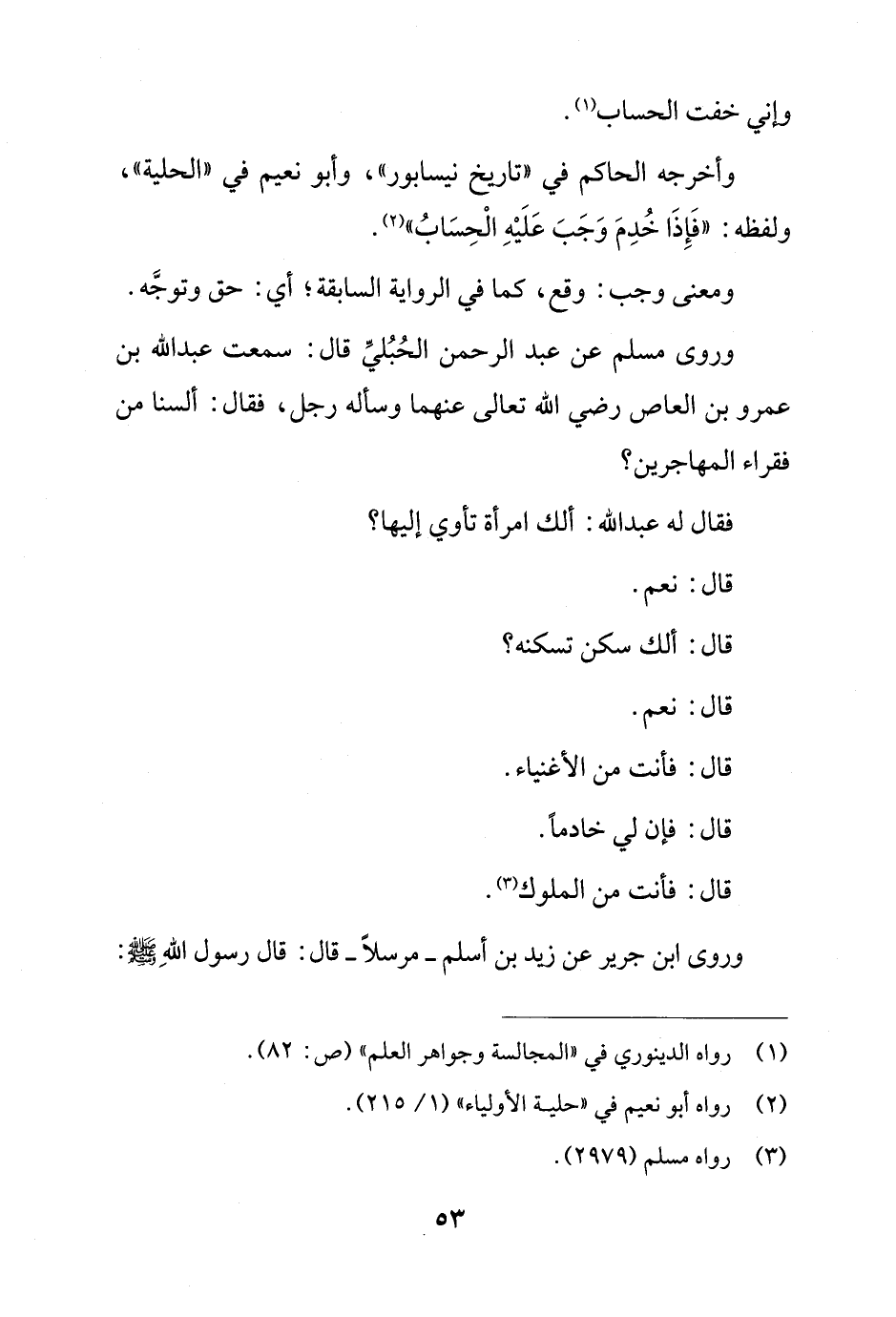 وروى مسلم عن عبد الرحمن الحُبُليِّ قال: سمعت عبد الله بن عمرو بن العاص رضي الله تعالى عنهما وسأله رجل، فقال: ألسنا من فقراء المهاجرين؟