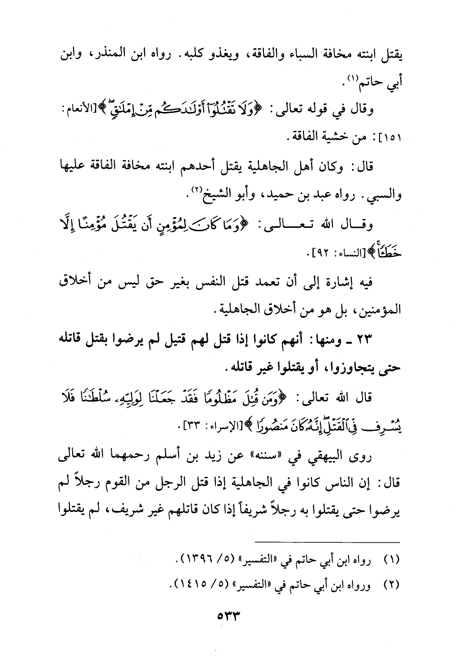 قال: وكان أهل الجاهلية يقتل أحدهم ابنته مخافة الفاقة عليها والسبي. رواه عبد بن حميد، وأبو الشيخ (¬2).