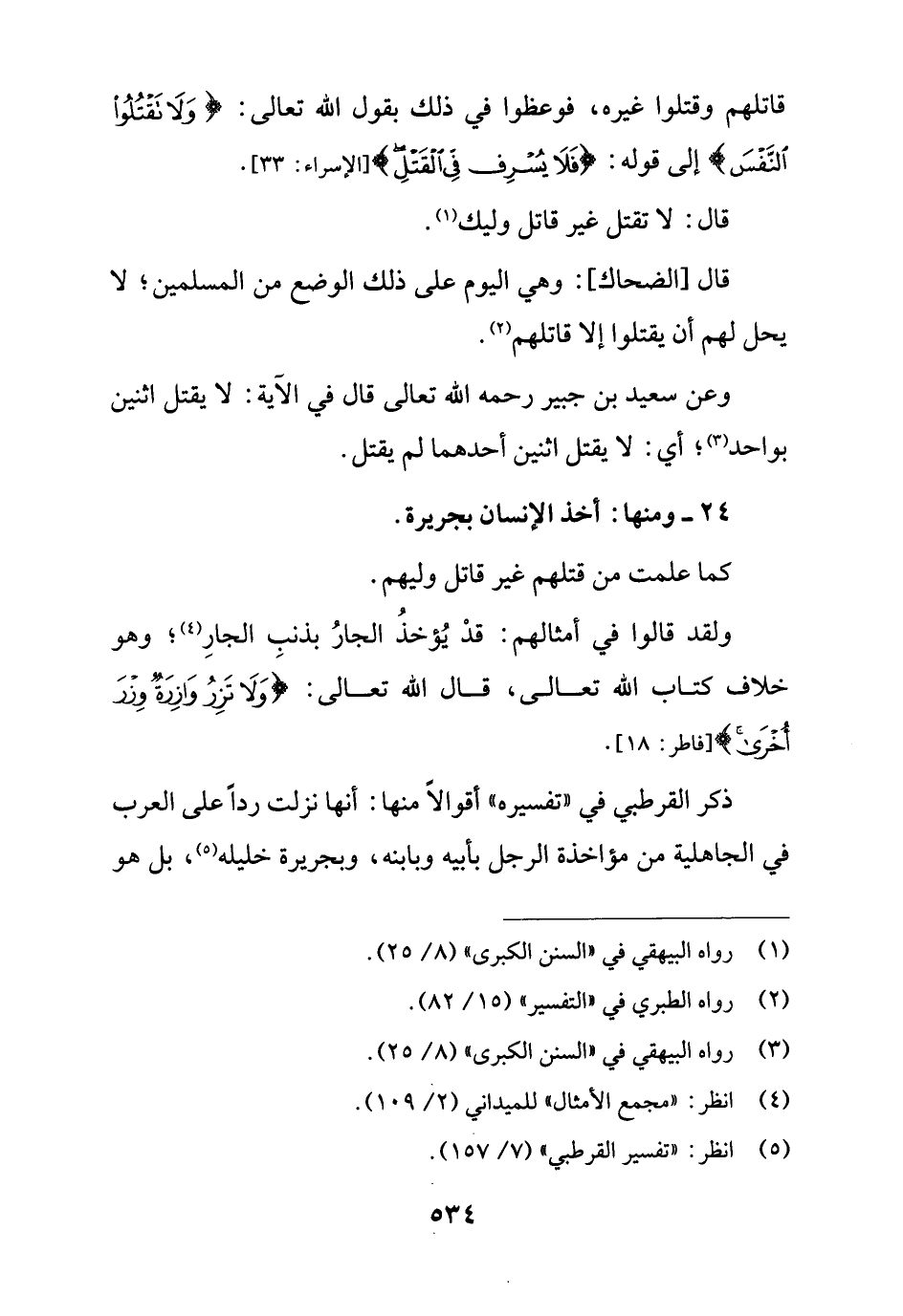 ولقد قالوا في أمثالهم: قدْ يُؤخذُ الجارُ بذنبِ الجارِ (¬4)؛ وهو خلف كتاب الله تعالى، قال الله تعالى: {وَلَا تَزِرُ وَازِرَةٌ وِزْرَ أُخْرَى} [فاطر: 18].
