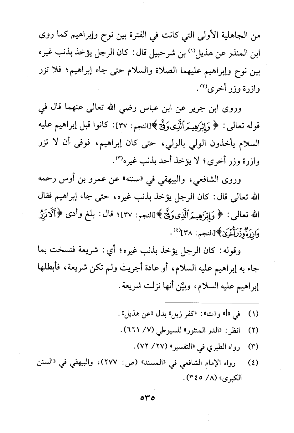 وروى ابن جرير عن ابن عباس رضي الله تعالى عنهما قال في قوله تعالى: {وَإِبْرَاهِيمَ الَّذِي وَفَّى} [النجم: 37]: كانوا قبل إبراهيم عليه السلام يأخذون الولي بالولي، حتى كان إبراهيم، فوفى أن لا تزر وازرة وزر أخرى؛ لا يؤخذ أحد بذنب غيره (¬3).