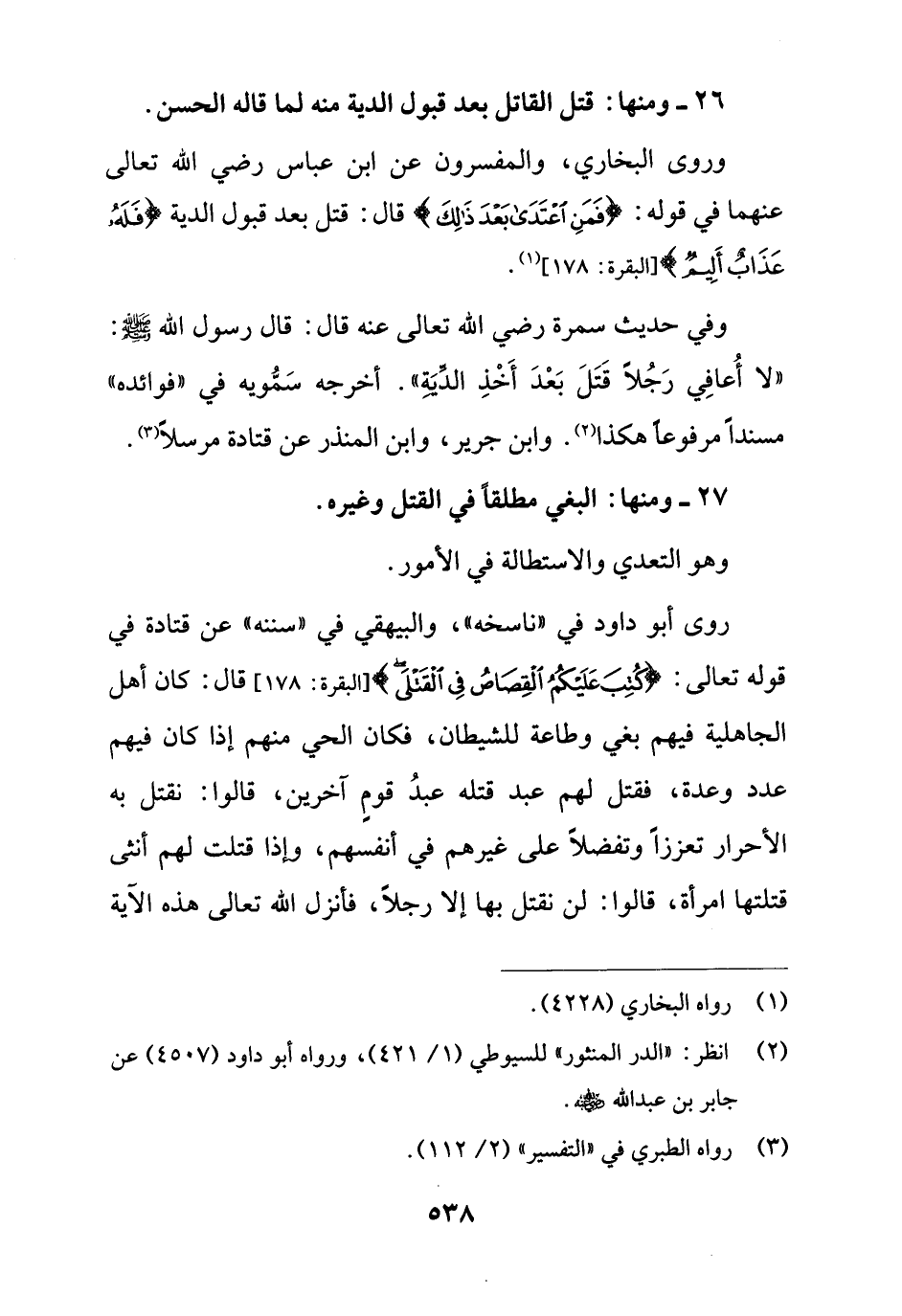 وروى البخاري، والمفسرون عن ابن عباس رضي الله تعالى عنهما في قوله: {فَمَنِ اعْتَدَى بَعْدَ ذَلِكَ} قال: قتل بعد قبول الدية {فَلَهُ عَذَابٌ أَلِيمٌ} [البقرة: 178] (¬1).