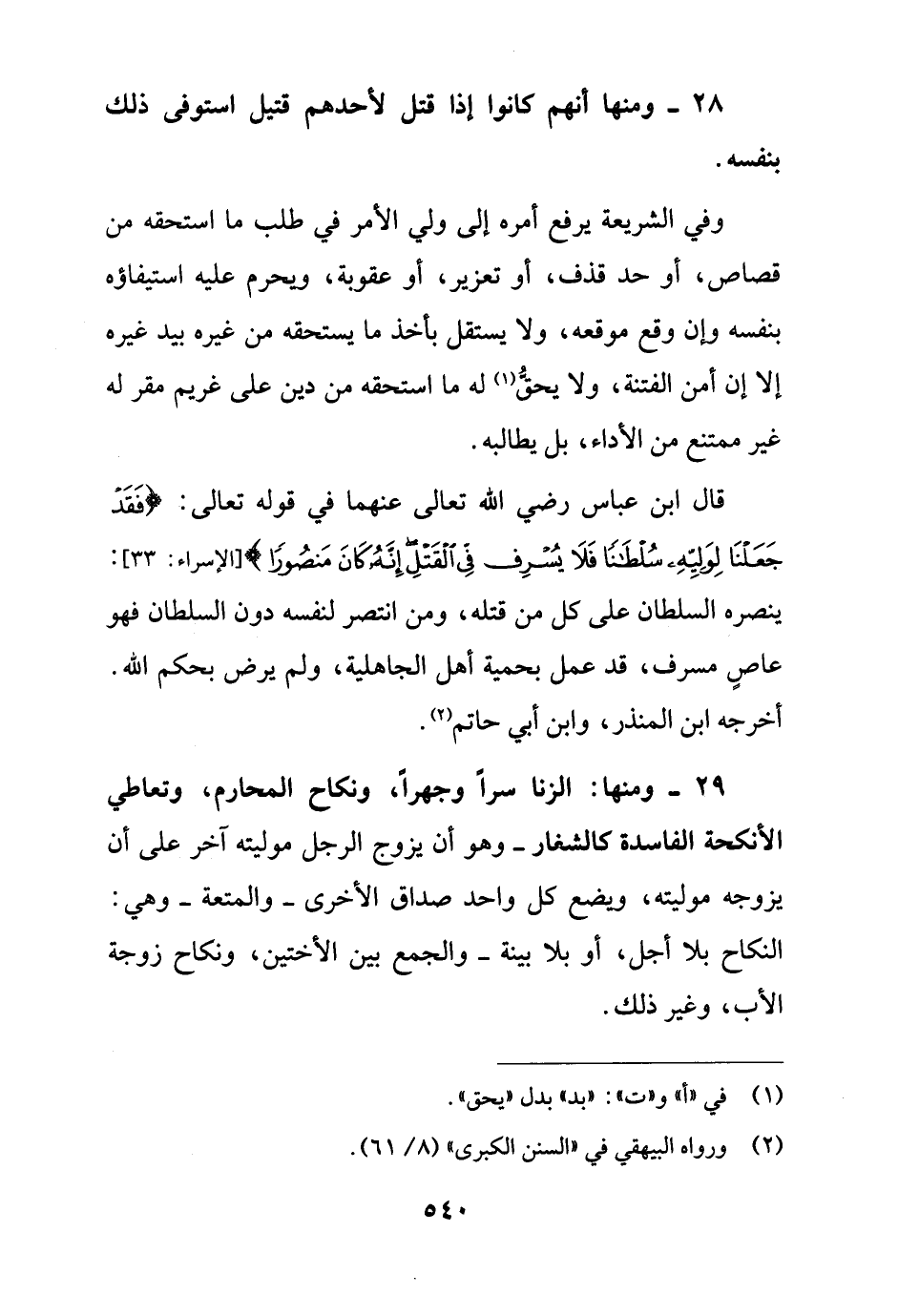 قال ابن عباس رضي الله تعالى عنهما في قوله تعالى: {فَقَدْ جَعَلْنَا لِوَلِيِّهِ سُلْطَانًا فَلَا يُسْرِفْ فِي الْقَتْلِ إِنَّهُ كَانَ مَنْصُورًا} [الإسراء: 33]: ينصره السلطان على كل من قتله، ومن انتصر لنفسه دون السلطان فهو عاصٍ مسرف، قد عمل بحمية أهل الجاهلية، ولم يرض بحكم الله. أخرجه ابن المنذر، وابن أبي حاتم (¬2).