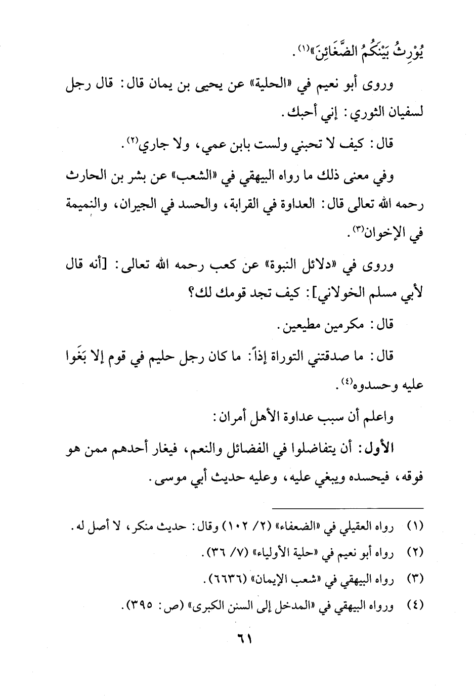 وفي معنى ذلك ما رواه البيهقي في "الشعب" عن بشر بن الحارث رحمه الله تعالى قال: العداوة في القرابة، والحسد في الجيران، والنميمة في الإخوان (¬3).