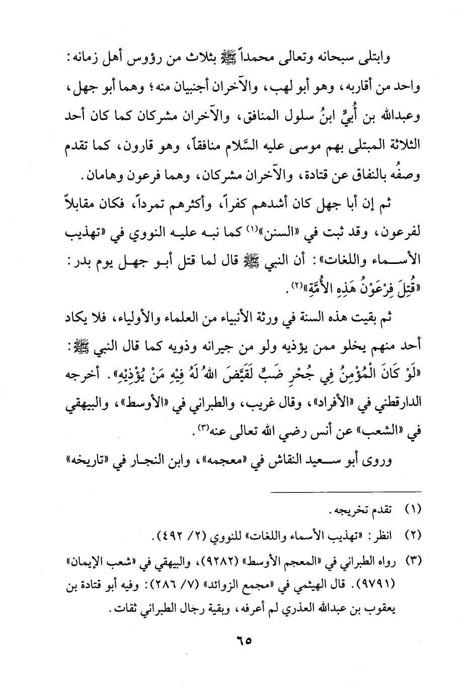 وابتلى سبحانه وتعالى محمدًا - صلى الله عليه وسلم - بثلاث من رؤوس أهل زمانه: واحد من أقاربه، وهو أبو لهب، والآخران أجنبيان منه؛ وهما أبو جهل، وعبد الله بن أُبيِّ ابنُ سلول المنافق، والآخران مشركان كما كان أحد الثلاثة المبتلى بهم موسى عليه السَّلام منافقًا، وهو قارون، كما تقدم وصفُه بالنفاق عن قتادة، والآخران مشركان، وهما فرعون وهامان.