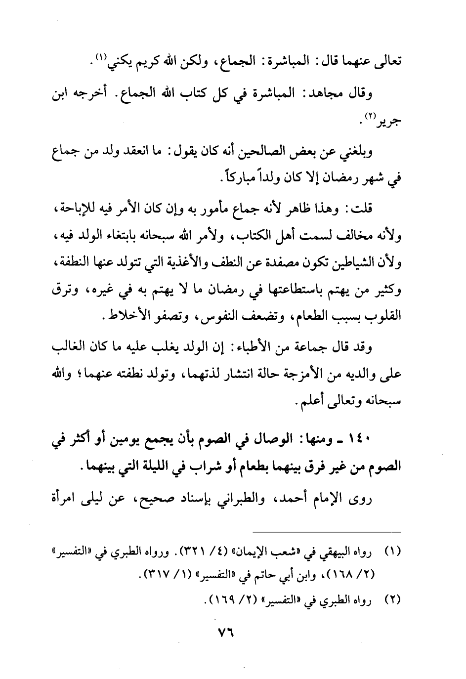 140 - ومنها: الوصال في الصوم بأن يجمع يومين أو أكثر في الصوم من غير فرق بينهما بطعام أو شراب في الليلة التي بينهما.