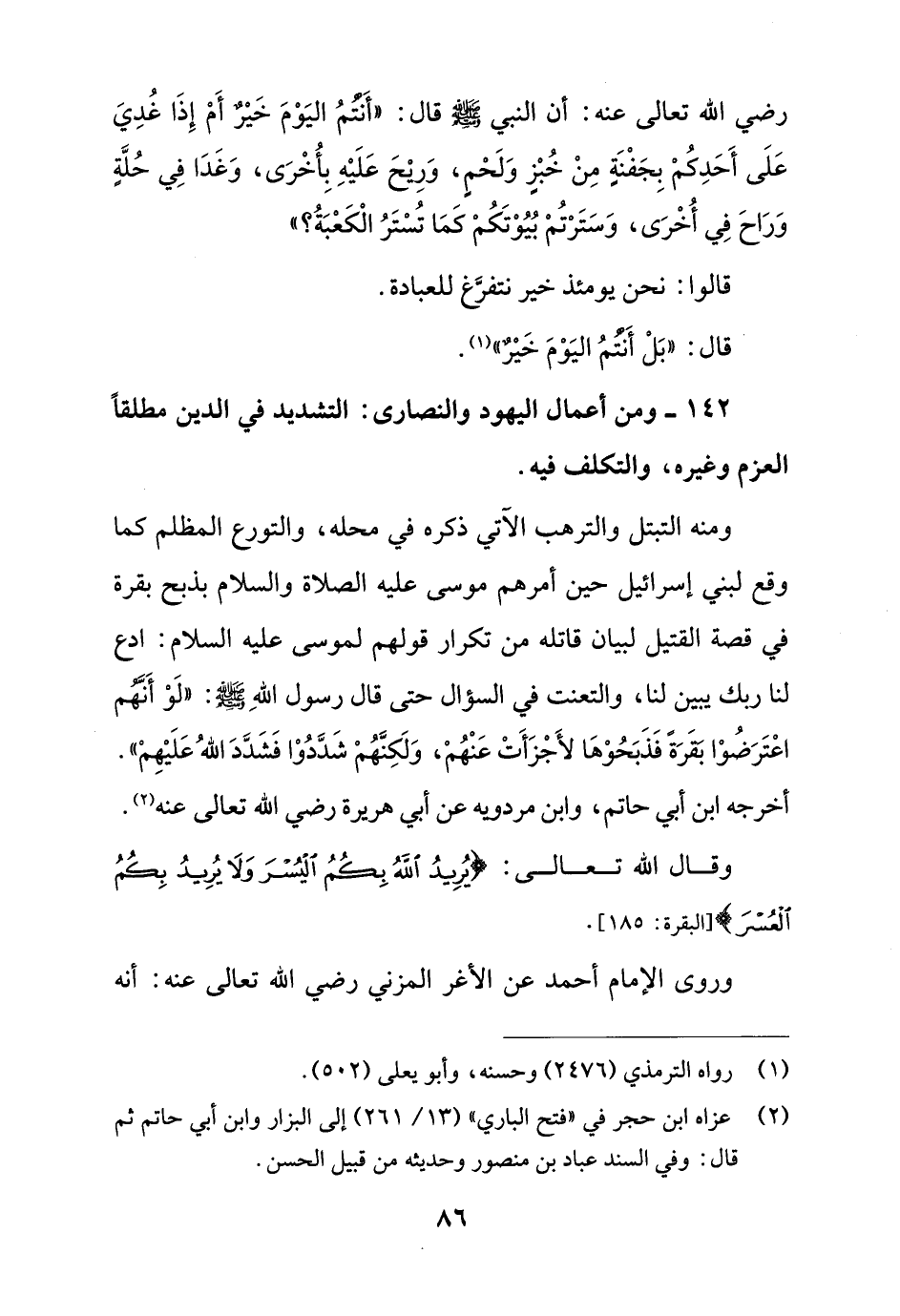 142 - ومن أعمال اليهود والنصارى: التشديد في الدين مطلقًا العزم وغيره، والتكلف فيه.