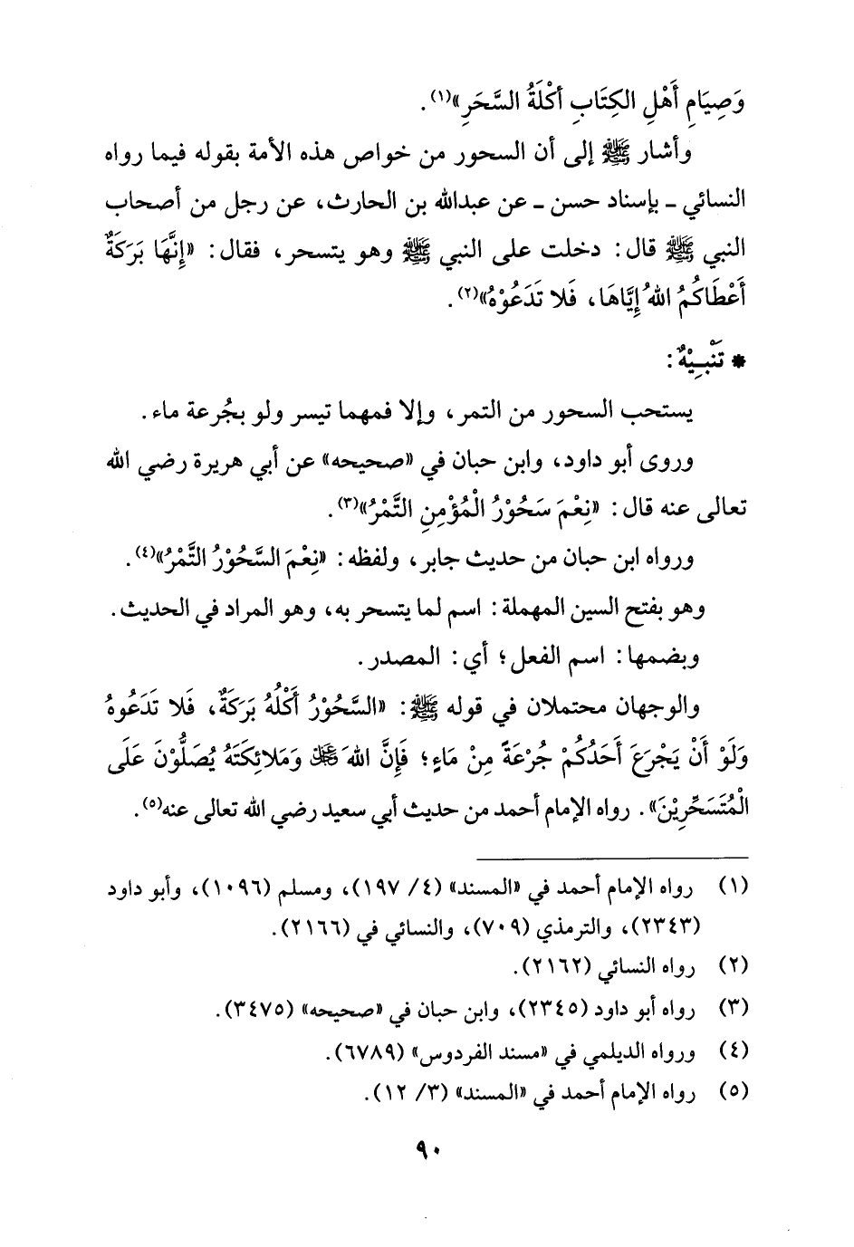 وأشار - صلى الله عليه وسلم - إلى أن السحور من خواص هذه الأمة بقوله فيما رواه النسائي -بإسناد حسن- عن عبد الله بن الحارث، عن رجل من أصحاب النبي -صلى الله عليه وسلم- قال: دخلت على النبي -صلى الله عليه وسلم- وهو يتسحر، فقال: "إِنَّها بَرَكَةٌ أَعْطاكُمُ اللهُ إِيَّاها، فَلا تَدَعُوْهُ" (¬2).