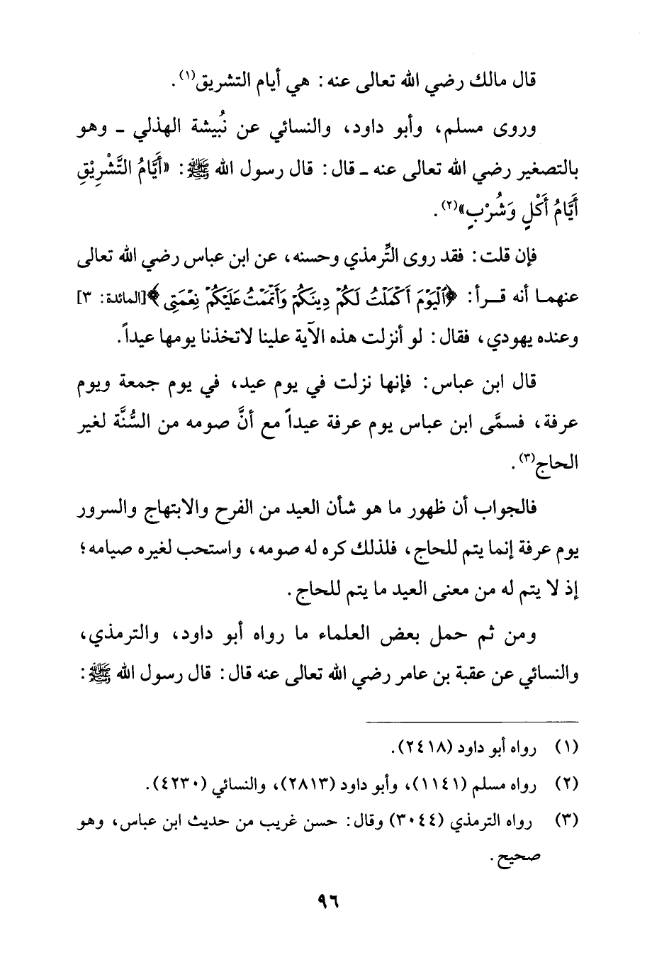 وروى مسلم، وأبو داود، والنسائي عن نبُيشة الهذلي -وهو بالتصغير رضي الله تعالى عنه- قال: قال رسول الله -صلى الله عليه وسلم-: " أَيَّامُ التَّشْرِيْقِ أَيَّامُ أَكْلِ وَشُرْبٍ" (¬2).