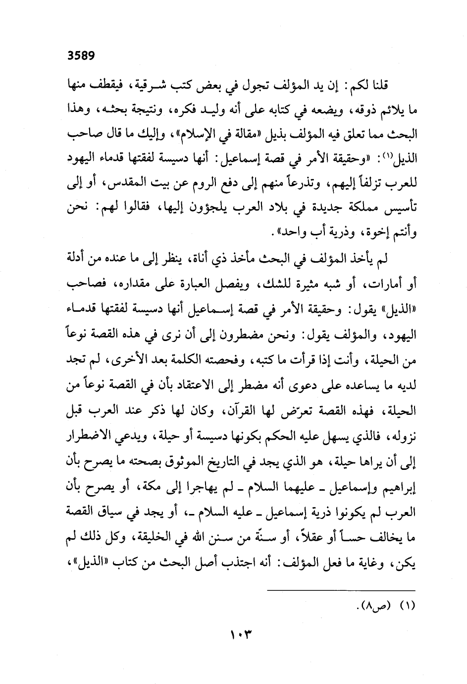 قلنا لكم: إن يد المؤلف تجول في بعض كتب شرقية، فيقطف منها ما يلائم ذوقه، ويضعه في كتابه على أنه وليد فكره، ونتيجة بحثه، وهذا البحث مما تعلق فيه المؤلف بذيل "مقالة في الإسلام"، وإليك ما قال صاحب الذيل (¬1): "وحقيقة الأمر في قصة إسماعيل: أنها دسيسة لفقتها قدماء اليهود للعرب تزلفًا إليهم، وتذرعًا منهم إلى دفع الروم عن بيت المقدس، أو إلى تأسيس مملكة جديدة في بلاد العرب يلجؤون إليها، فقالوا لهم: نحن وأنتم إخوة، وذرية أبي واحد".