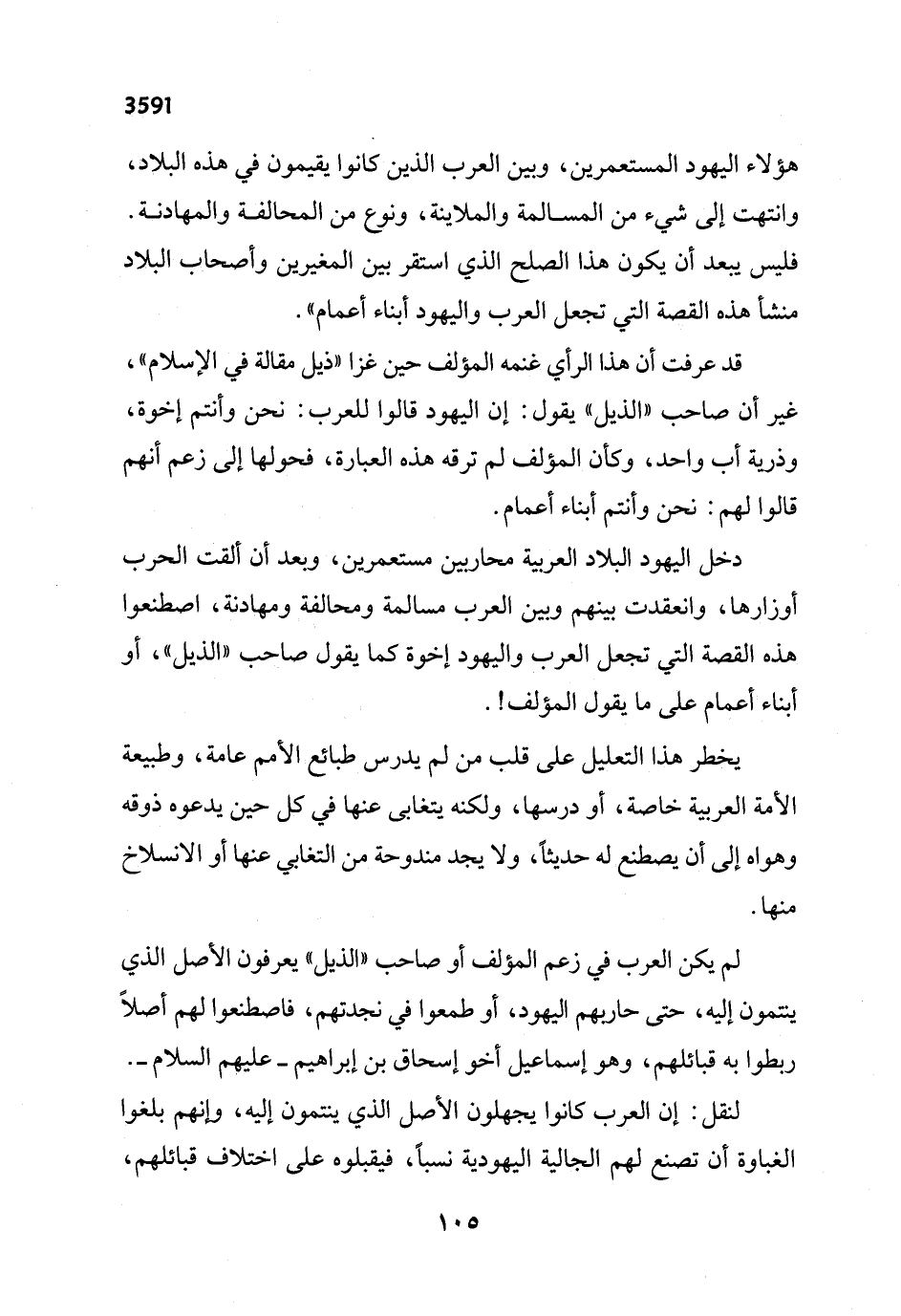 دخل اليهود البلاد العربية محاربين مستعمرين، وبعد أن ألقت الحرب أوزارها، وانعقدت بينهم وبين العرب مسالمة ومحالفة ومهادنة، اصطنعوا هذه القصة التي تجعل العرب واليهود إخوة كما يقول صاحب "الذيل"، أو أبناء أعمام على ما يقول المؤلف!.