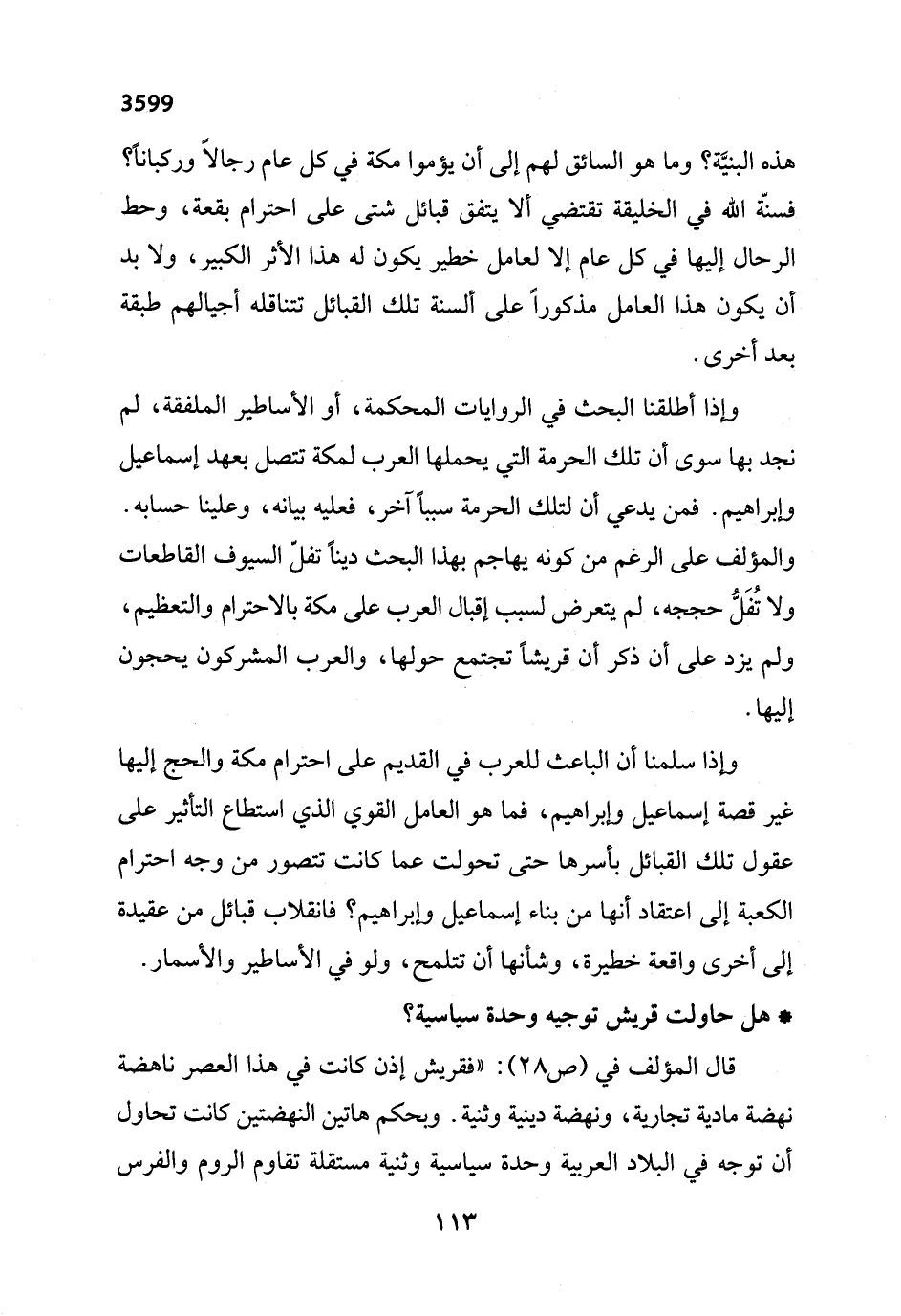 وإذا أطلقنا البحث في الروايات المحكمة، أو الأساطير الملفقة، لم نجد بها سوى أن تلك الحرمة التي يحملها العرب لمكة تتصل بعهد إسماعيل وإبراهيم. فمن يدعي أن لتلك الحرمة سبباً آخر، فعليه بيانه، وعلينا حسابه. والمؤلف على الرغم من كونه يهاجم بهذا البحث ديناً تفلّ السيوف القاطعات ولا تُفَلُّ حججه، لم يتعرض لسبب إقبال العرب على مكة بالاحترام والتعظيم، ولم يزد على أن ذكر أن قريشاً تجتمع حولها، والعرب المشركون يحجون إليها.