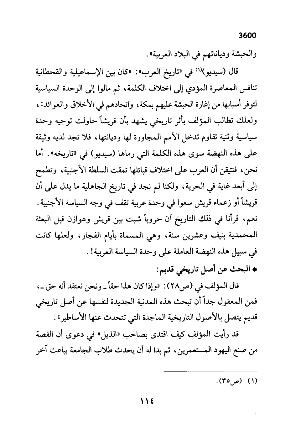 قال (سيديو) (¬1) في "تاريخ العرب": "كان بين الإسماعيلية والقحطانية تنافس المعاصرة المؤدي إلى اختلاف الكلمة، ثم مالوا إلى الوحدة السياسية لتوفر أسبابها من إغارة الحبشة عليهم بمكة، واتحادهم في الأخلاق والعوائد"، ولعلك تطالب المؤلف بأثر تاريخي يشهد بأن قريشاً حاولت توجيه وحدة سياسية وثنية تقاوم تدخل الأمم المجاورة لها وديانتها، فلا تجد لديه وثيقة على هذه النهضة سوى هذه الكلمة التي رماها (سيديو) في "تاريخه". أما نحن، فنتيقن أن العرب على اختلاف قبائلها تمقت السلطة الأجنبية، وتطمح إلى أبعد غاية في الحرية، ولكنا لم نجد في تاريخ الجاهلية ما يدل على أن قريشاً أو زعماء قريش سعوا في وحدة عربية تقف في وجه السياسة الأجنبية.