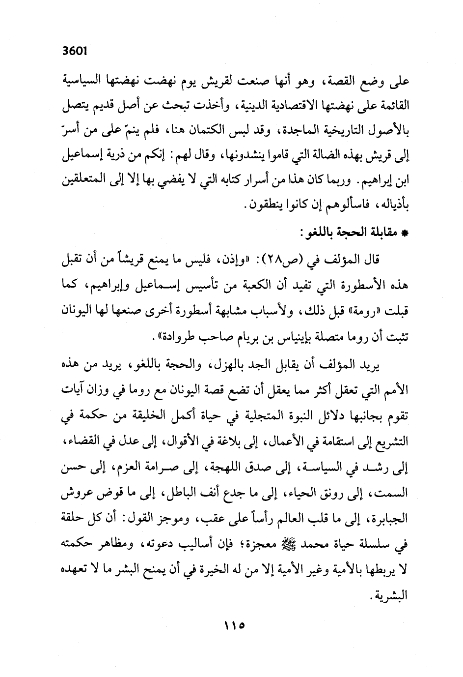 يريد المؤلف أن يقابل الجد بالهزل، والحجة باللغو، يريد من هذه الأمم التي تعقل أكثر مما يعقل أن تضع قصة اليونان مع روما في وزان آيات تقوم بجانبها دلائل النبوة المتجلية في حياة أكمل الخليقة من حكمة في التشريع إلى استقامة في الأعمال، إلى بلاغة في الأقوال، إلى عدل في القضاء، إلى رشد في السياسة، إلى صدق اللهجة، إلى صرامة العزم، إلى حسن السمت، إلى رونق الحياء، إلى ما جدع أنف الباطل، إلى ما قوض عروش الجبابرة، إلى ما قلب العالم رأساً على عقب، وموجز القول: أن كل حلقة في سلسلة حياة محمد - صلى الله عليه وسلم - معجزة؛ فإن أساليب دعوته، ومظاهر حكمته لا يربطها بالأمية وغير الأمية إلا من له الخيرة في أن يمنح البشر ما لا تعهده البشرية.