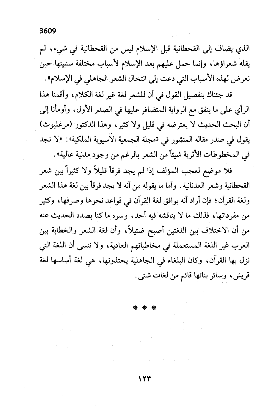 فلا موضع لعجب المؤلف إذا لم يجد فرقاً قليلاً ولا كثيراً بين شعر القحطانية وشعر العدنانية. وأما ما يقوله من أنه لا يجد فرقاً بين لغة هذا الشعر ولغة القرآن؛ فإن أراد أنه يوافق لغة القرآن في قواعد نحوها وصرفها، وكثير من مفرداتها، فذلك ما لا يناقشه فيه أحد، وسره ما كنا بصدد الحديث عنه من أن الاختلاف بين اللغتين أصبح ضئيلًا، وأن لغة الشعر والخطابة بين العرب غير اللغة المستعملة في مخاطباتهم العادية، ولا ننسى أن اللغة التي نزل بها القرآن، وكان البلغاء في الجاهلية يحتذونها، هي لغة أساسها لغة قريش، وسائر بنائها قائم من لغات شتى.
