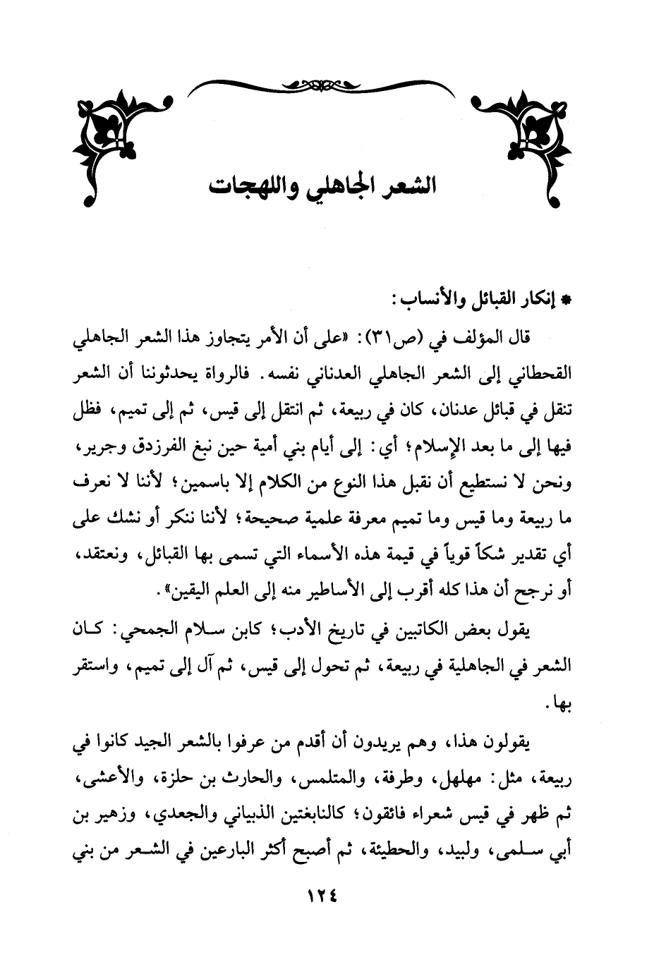 قال المؤلف في (ص 31): "على أن الأمر يتجاوز هذا الشعر الجاهلي القحطاني إلى الشعر الجاهلي العدناني نفسه. فالرواة يحدثوننا أن الشعر تنقل في قبائل عدنان، كان في ربيعة، ثم انتقل إلى قيس، ثم إلى تميم، فظل فيها إلى ما بعد الإِسلام؛ أي: إلى أيام بني أمية حين نبغ الفرزدق وجرير، ونحن لا نستطيع أن نقبل هذا النوع من الكلام إلا باسمين؛ لأننا لا نعرف ما ربيعة وما قيس وما تميم معرفة علمية صحيحة؛ لأننا ننكر أو نشك على أي تقدير شكاً قوياً في قيمة هذه الأسماء التي تسمى بها القبائل، ونعتقد، أو نرجح أن هذا كله أقرب إلى الأساطير منه إلى العلم اليقين".