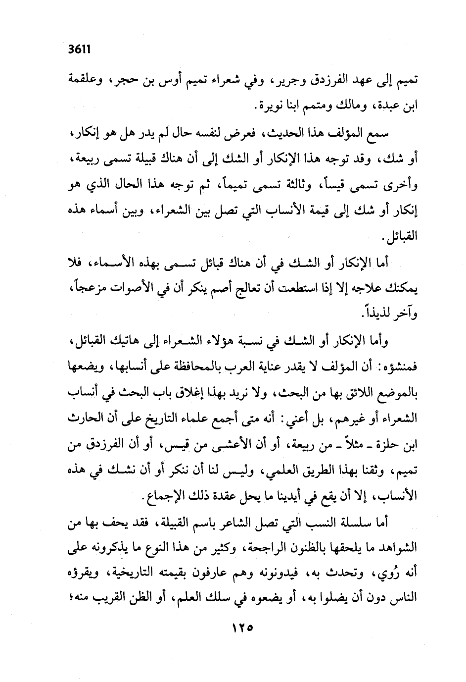 وأما الإنكار أو الشك في نسبة هؤلاء الشعراء إلى هاتيك القبائل، فمنشؤه: أن المؤلف لا يقدر عناية العرب بالمحافظة على أنسابها، ويضعها بالموضع اللائق بها من البحث، ولا يزيد بهذا إغلاق باب البحث في أنساب الشعراء أو غيرهم، بل أعني: أنه متى أجمع علماء التاريخ على أن الحارث ابن حلزة -مثلاً- من ربيعة، أو أن الأعشى من قيس، أو أن الفرزدق من تميم، وثقنا بهذا الطريق العلمي، وليس لنا أن ننكر أو أن نشك في هذه الأنساب، إلا أن يقع في أيدينا ما يحل عقدة ذلك الإجماع.